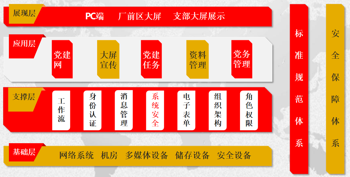 基于云计算、大数据、移动互联网等先进技术,以“搭建一个平台,统筹党务管理,强化支部建设,提升党建质量”为目标,建设涵盖党建网、网盘管理、党建任务、党务管理等功能于一体的智慧党建管理系统,实现工作任务立体考核和档案资料生命周期管理,满足党建管理的标准化、信息化、流程化、智能化需求。