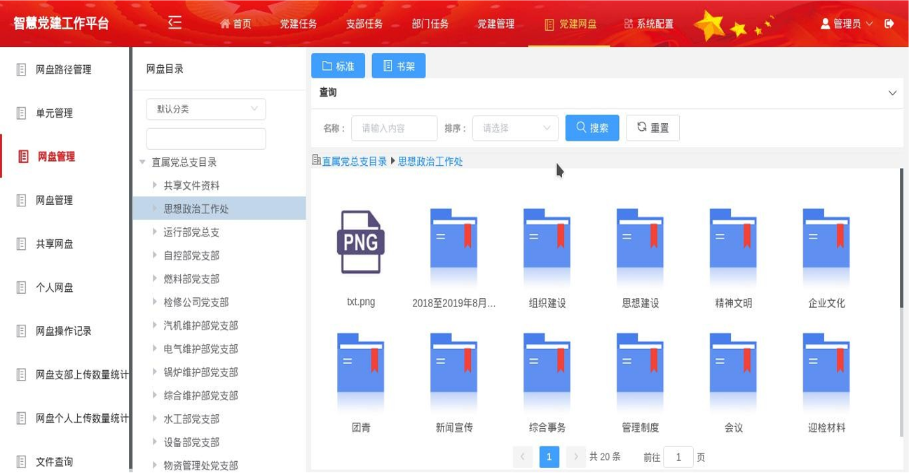 用于党建文件资料的管理、存储、共享,包括党建资料存储、智能文件搜索、智能目录分类、智能文件组合、批量复制/下载、共享网盘、个人网盘等。实现了党建资料云存储,查询快、准、全;协同共享透明化,工作真、细、实;提升了党建管理工作的便捷性、文档资料的完整性和持久性。