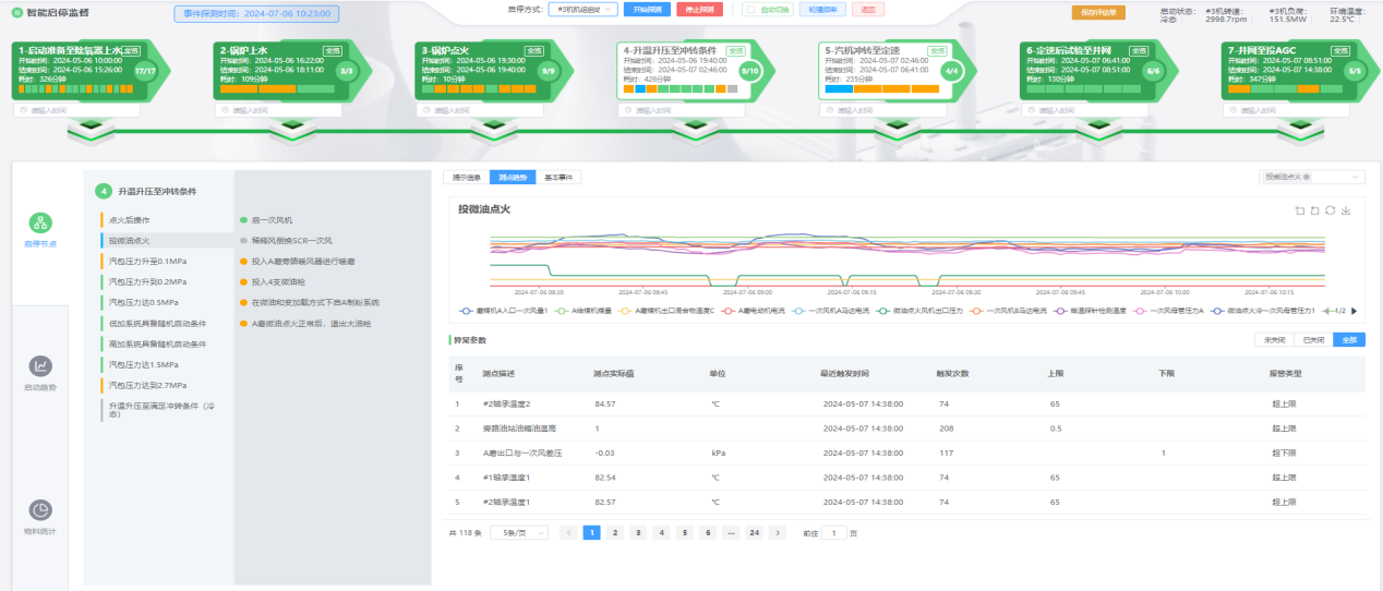 包括机组启停全过程节点展示、全过程重要参数报警展示、重要参数趋势展示、启停过程标准曲线区域范围展示、物料消耗统计、自动生成操作评估报告、机组启停重要参数展示等功能,实时反映机组启停过程,将机组启停过程注意事项、管理要点融入模型,实现规范引导运行人员操作,合理控制推进操作进度,实时预警越限参数,对启停物料消耗进行统计,及时汇总生成操作评估单,便于分析,不断寻优。